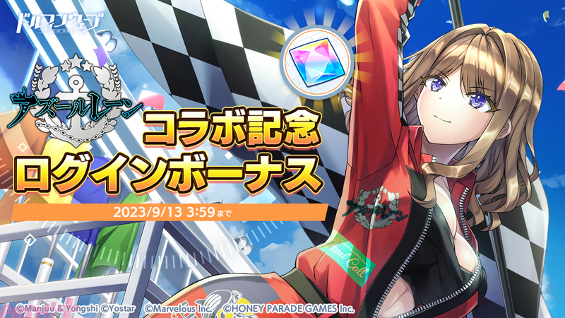 アズールレーンコラボ開催を記念して“アズールレーンコラボガチャ”が開催。コラボ限定衣装を着た“URヴィーナ(スプレンディッド・ギア)”と“URヘリー・ルイス(凄艶のマックススピード)”の他にコラボ限定メモリーが登場します。