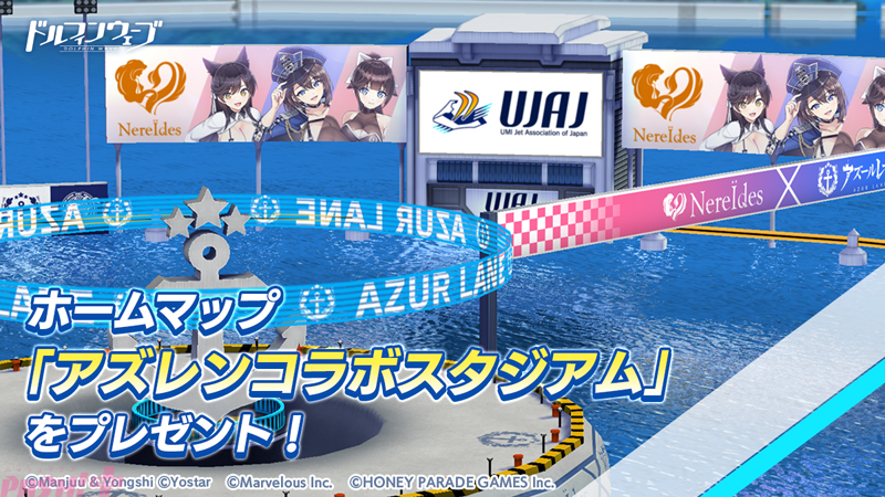 『アズレン』コラボを記念して、シナリオイベント“Dolphin with AZURLANE”が開催。イベント報酬として限定SSRドルフィン“セレナ・ルイス(魅惑のフルドライブ)”などの報酬が手に入るほか、開催を記念したアズールレーンコラボ仕様のマシンラッピング“スプレンディッド・レーン”が登場します。