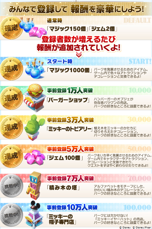 アプリ『ディズニー マジックキングダムズ』の事前登録キャンペーンで、事前登録数が5万人を突破した。これにより、事前登録数に応じてゲームプレイ中に受け取れる報酬に、ゲーム内アイテム「マジック1000個」、「ハンバーガーショップ」、「ミッキーのトピアリー」に加え「ジェム100個」が新たに追加される。