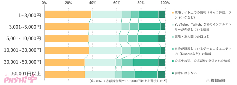3:月に1~3,000円課金するライト課金者層、10,001~30,000円のアッパーミドル課金者層は特に攻略サイトを参考にしており、30,001~50,000円以上のアッパー課金者層ほど、ゲームコミュニティ内での情報を重視する傾向がみられた