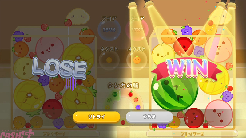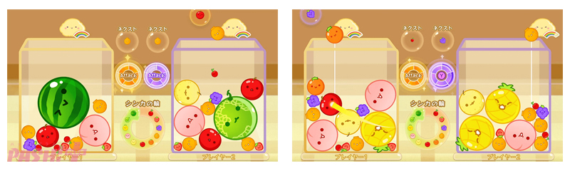 相手をゲームオーバーにした方が勝ちです。小さなフルーツを二つ合わせて大きくしていく“シンカ”を5回繰り返すごとにフルーツを相手のボックスに送り込み、任意のタイミングで落とすことができます。