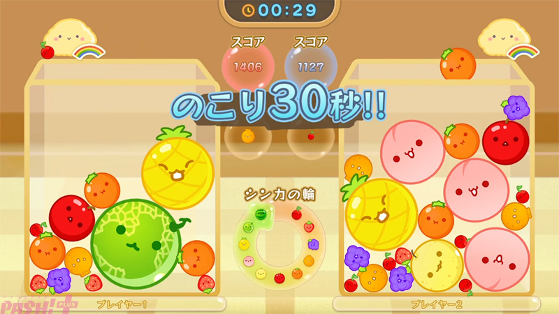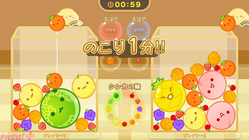 5分間の時間制限の中で各プレイヤーがスコアを競います。終了時点でスコアが高いプレイヤーが勝ちです。虹のゲージがなくなるとポッピィーがフルーツを勝手に落としてくるので、素早い判断が求められます。