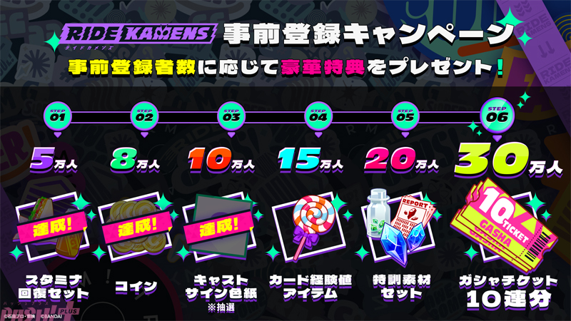 『ライドカメンズ』では最終的な事前登録者数に応じて、アプリ内でのゲームプレイに役立つ豪華アイテムを、本アプリを事前登録した方全員にプレゼントする「事前登録キャンペーン」を開催中です。