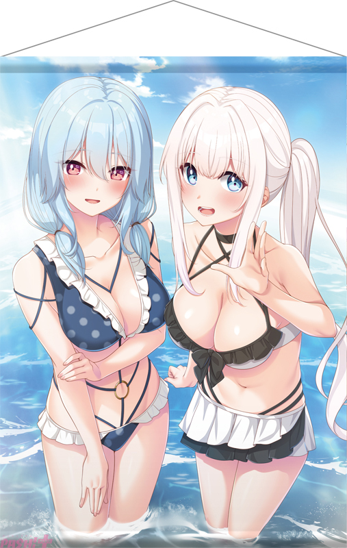 限定版パッケージイラストの氷華と満留の水着イラストをB2大判サイズで楽しめます! 少し恥ずかしがりながらも、大胆なビキニ姿で微笑むふたりのイラストはこのタペストリーと限定版パッケージのみの描きおろしとなります。