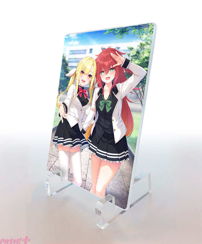 通常版パッケージイラストの桜雅と千羽の制服姿のイラストが透け感のあるアクリルパネルになりました。主人公と3人で一緒に登校するのが楽しくてしかたないふたりのイラストは、このパネルと通常版パッケージのみの描きおろしとなります。