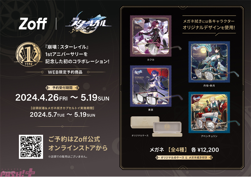 本日からZoffコラボメガネセットの予約受付を開始いたしました。カフカ、丹恒・飲月、黄泉、アベンチュリンをモチーフにしたオリジナルメガネのフレームデザインが一挙公開! 全4種類の個性あるオリジナルフレーム、開拓者様ならどれを選びますか?