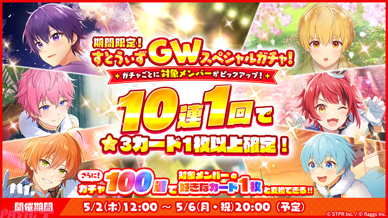 STPRとflaggs(フラッグス)は、本日5月2日(木)にエンタメユニット「すとぷり」の公式ゲームアプリ『すとぷりWith!!(すとうぃず)』のGW特別企画「期間限定!すとうぃずGWスペシャルガチャ!」を開催します。