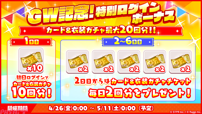 4月26日(金)より、「GW記念!特別ログインボーナス」を実施中です。開催期間中にログインすると、初日にカード&衣装ガチャチケットが10枚、2日目以降に毎日2枚ずつ、合計で20枚獲得いただけます。