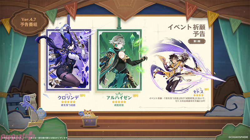 またVer.4.7では、「アルハイゼン」と「フリーナ」が復刻登場予定です。イベント祈願前半では、「クロリンデ」「セトス」「アルハイゼン」が登場し、後半では、「シグウィン」「フリーナ」が登場します。