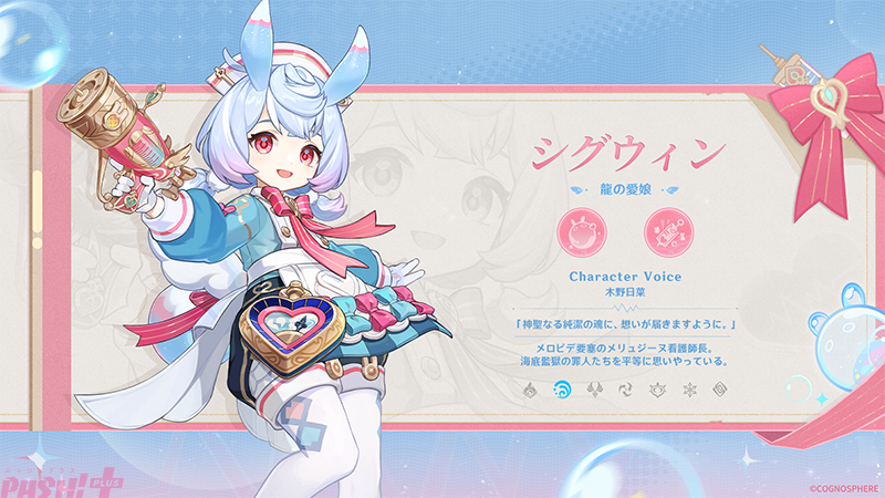 戦闘において、命の契約を利用してチームメンバーをサポートする。彼女の治癒量は、チーム全体の命の契約の合計値を基に増加。また戦闘中、シグウィンは大きなバブルを発射し、周囲の敵を束縛してダメージを与えると同時に、チーム内の他のキャラクターのHPを回復したり、ダメージをアップしてくれる。