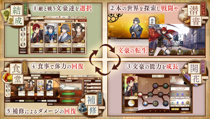 「潜書」には行動の中心となる「有碍書」があり、穢れた文学書を浄化するための戦闘が始まります。その他のコンテンツでは戦闘に備えるための事前準備が行えます。