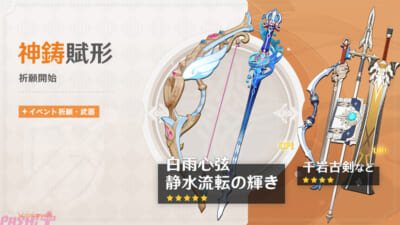6月25日(火)より、イベント祈願・武器「神鋳賦形」を開催しました。期間中、新★5武器「弓・白雨心弦」、限定★5武器「片手剣・静水流転の輝き」などの出現率が大幅にUPします。