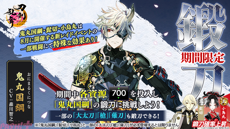 2024年7月30日(火)メンテナンス後より、刀剣男士「鬼丸国綱(声優:森川智之)」が期間限定で各資源「700」の鍛刀に登場します。また、今回の「期間限定鍛刀キャンペーン」では、期間中の各資源700の鍛刀において、刀剣男士「髭切(ひげきり)(声優:花江夏樹)」「小烏丸(こがらすまる)(声優:保志総一朗)」の鍛刀確率が上昇し、一部の「大太刀」「槍」「薙刀」の刀剣男士も鍛刀に登場します。
