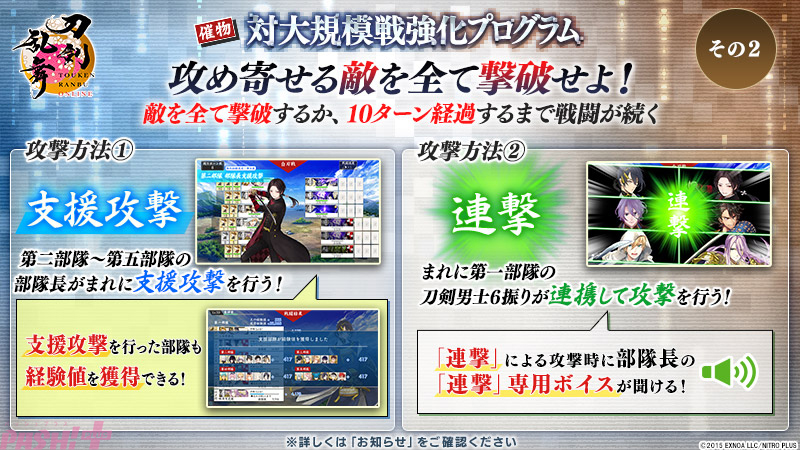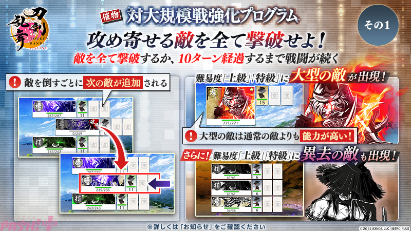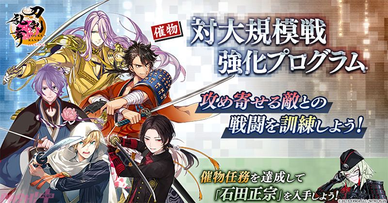EXNOAは、同社が開発・運営、ニトロプラスが世界観・シナリオ・キャラクターデザインを担当している刀剣育成シミュレーション『刀剣乱舞ONLINE』にて、2024年7月30日(火)メンテナンス後より新イベント「対大規模戦強化プログラム」を開催中です。