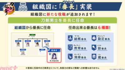 2024年7月23日(火)のメンテナンスにて、新たに「番長」と「審神者証(さにわしょう)」が実装。刀剣男士を6種類の「番長」にそれぞれ任命できるようになったほか、「審神者証」では審神者としてのこれまでの記録や本丸の状況を確認できます。
