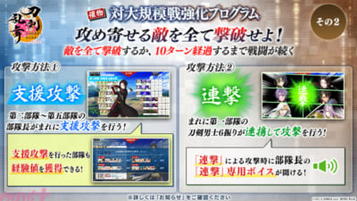 「対大規模戦強化プログラム」の戦闘では、第二部隊から第五部隊の部隊長による「支援攻撃」や第一部隊による連携攻撃「連撃」が特定の条件下で発生します。