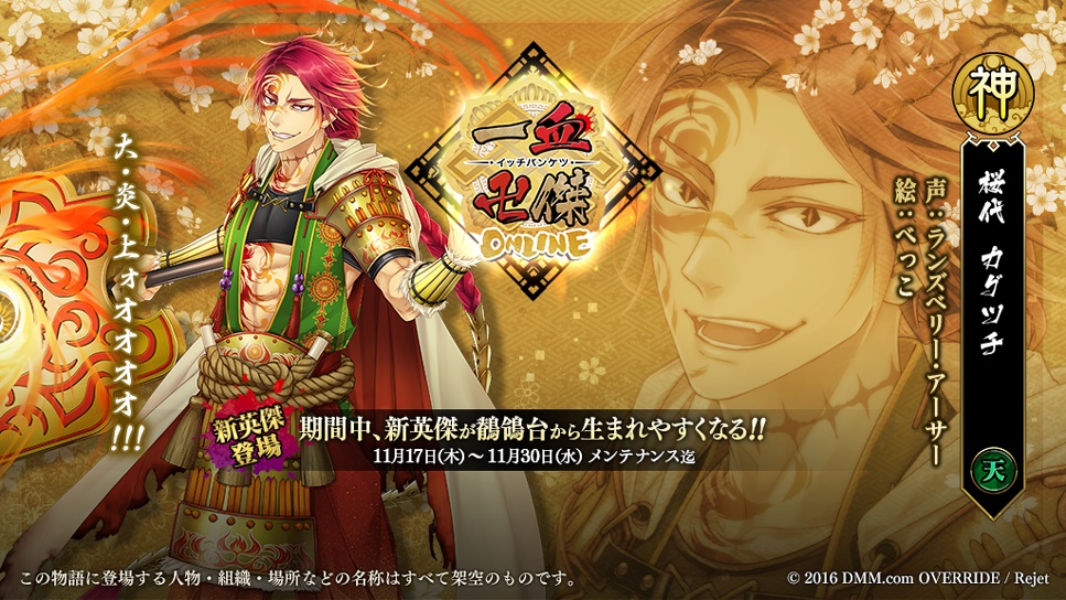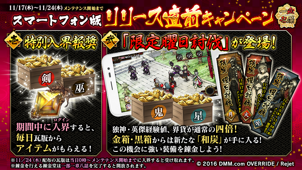 『一血卍傑-ONLINE-』にて2016年11月17日(木)メンテナンス後より「スマートフォン版リリース直前キャンペーン」開催を含むアップデートを実施する。