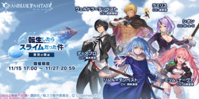 Cygamesとサイゲームスの子会社であるCyDesignationとの共同制作によるRPG『グランブルーファンタジー』にて、11月15日(金)17:00~11月27日(水)20:59の期間、「転生したらスライムだった件 蒼空の楔編」が開催されます。