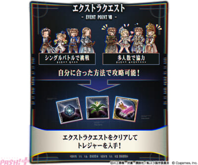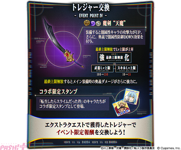 エクストラクエストで獲得したトレジャーで、イベント限定武器「魔剣“天魔”」やコラボ限定スタンプを獲得しましょうまた、「エクストラクエスト」の難易度「特Sランク(天災級)」やマルチバトルで手に入るトレジャーで、イベント限定武器の最終上限解放が可能に。11月20日(水)からは新たなイベント召喚石も追加されます。