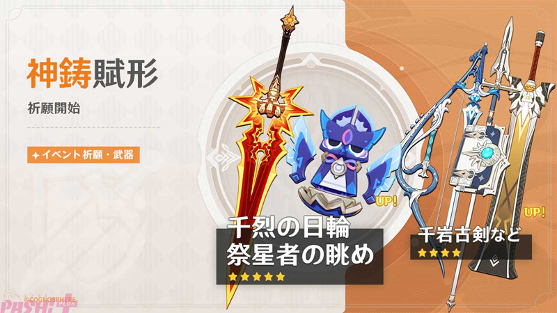 1月1日(水)アップデート後より、イベント祈願・武器「神鋳賦形」を開催しました。期間中、新★5武器「両手剣・千烈の日輪」、「法器・祭星者の眺め」などの出現確率が大幅にUPします。