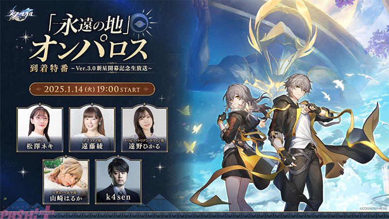 HoYoverseは、スペースファンタジーRPG『崩壊:スターレイル』において、1月14日(火)19:00より『「永遠の地」 オンパロス到着特番~Ver.3.0新星開幕記念生放送~』を配信予定です。豪華ゲスト陣が出演する生放送にて、最新情報や実機プレイなど盛りだくさんな内容を皆さんにお届けします。