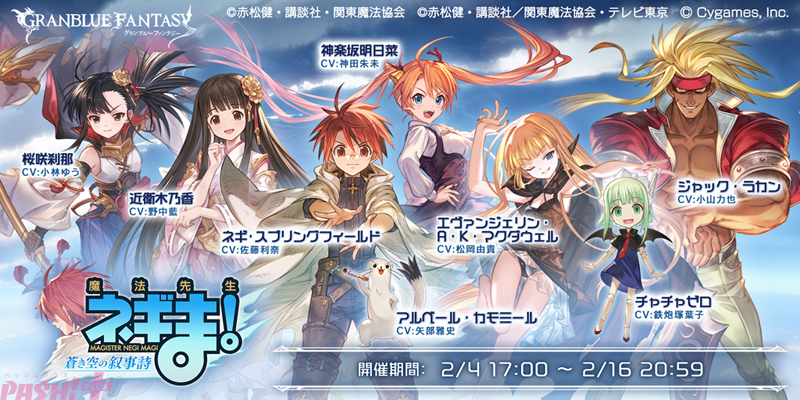 Cygamesとサイゲームスの子会社であるCyDesignationとの共同制作によるRPG『グランブルーファンタジー』にて、『魔法先生ネギま!』とのコラボレーションイベント「魔法先生ネギま! 蒼き空の叙事詩」が2月16日(日)20:59まで開催中です。