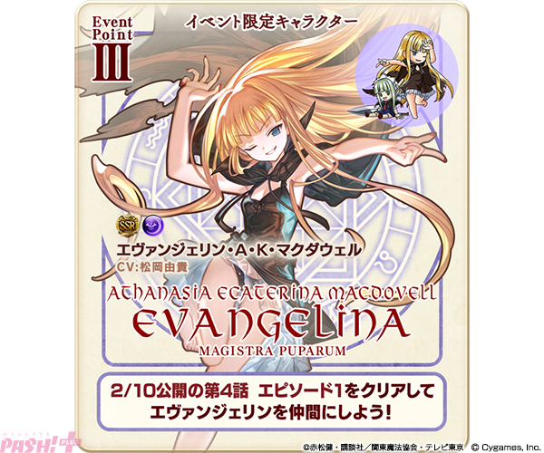2月10日(月)にイベントストーリーを追加。物語は結末へ! 第4話エピソード1をクリアすることで、キャラクター「エヴァンジェリン・A・K・マクダウェル」が仲間になります。