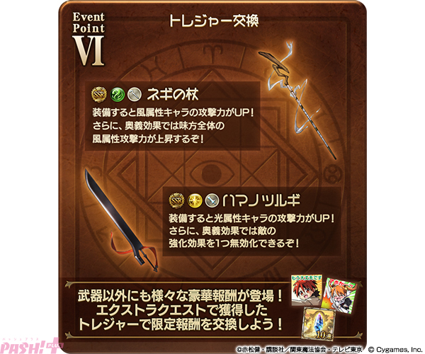 エクストラクエストで獲得したトレジャーで、イベント限定召喚石「神楽坂明日菜」やイベント限定武器「ネギの杖」、「ハマノツルギ」を獲得しよう!