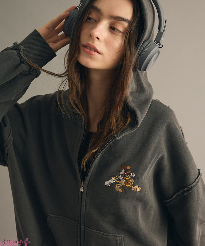 ピグメント加工を施したヴィンテージ仕様のスウェットアイテムは3型を展開。「ミッキーマウス」のサインをモチーフにしたロゴ入りのプルオーバーは、こなれ感のある一枚に。また、「ミッキーマウス」が乗馬をしている様子やカウボーイ姿を刺繍した、珍しいデザインのパーカーとパンツも用意。