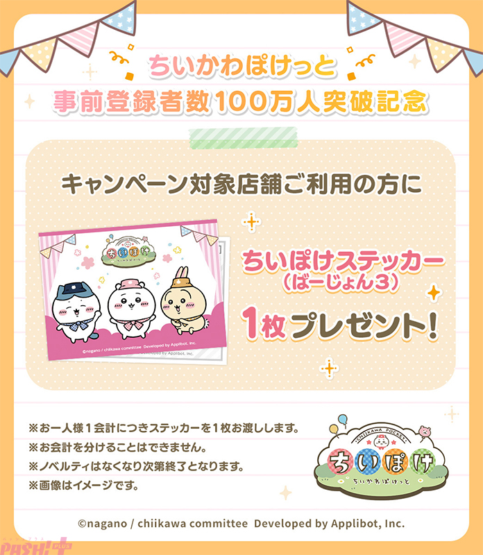事前登録者数100万人を記念して、『ちいぽけ』公式X(旧Twitter)にてリポストキャンペーンを開催します。第1弾として、公式Xをフォローして本キャンペーン対象ポストをリポストした人の中から抽選で100名に「ちいぽけステッカー(ばーじょん3)」をプレゼント。第2弾のキャンペーン詳細は、『ちいぽけ』公式Xにて後日公開します。