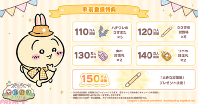 さらに、事前登録者数150万人達成時の特典が追加。150万人を達成すると、現物の「大きな討伐棒」を抽選でプレゼントするキャンペーンの実施が決定します。