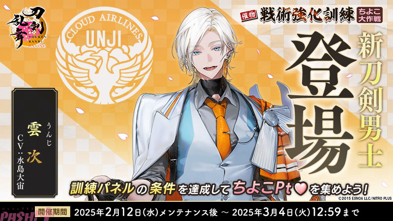 EXNOAは、同社が開発・運営、ニトロプラスが世界観・シナリオ・キャラクターデザインを担当している、刀剣育成シミュレーション『刀剣乱舞ONLINE』にて、2025年2月12日(水)メンテナンス後より新刀剣男士「雲次(cv.水島大宙)」を入手できるイベント「戦術強化訓練 ~ちよこ大作戦~」を開催していることを告知します。