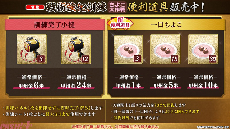 さらに、新たな便利道具「一口ちよこ」も期間限定で販売します。「一口ちよこ」は刀剣男士の気力を回復できる便利道具です。