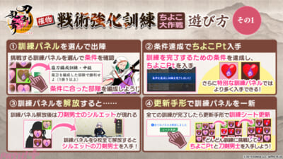 イベント「戦術強化訓練 ~ちよこ大作戦~」は、訓練パネルのさまざまな条件に合わせて部隊を編成し、条件を達成することで挑戦した訓練パネルを解放していくイベントです。訓練パネルを解放すると「ちよこPt(ちよこポイント)」を入手でき、集めることで新刀剣男士「雲次(うんじ)(cv.水島大宙)」のほか刀装や便利道具など、さまざまな報酬を獲得できます。
