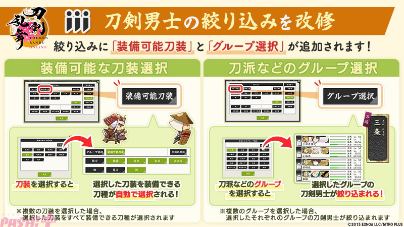2025年2月12日(水)のメンテナンスにて、刀剣男士を絞り込みにて表示する際、刀派などの「グループ選択」を行えるよう改修しました。また、刀剣男士に装備する刀装を選択する際に装備可能な刀装を絞り込むことも可能となりました。