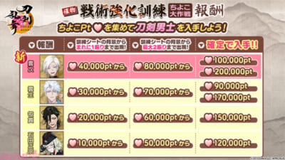 さらに、9枚の訓練パネルを全て解放することで、訓練シートの背景に表示される刀剣男士を入手できます。「ちよこPt」を一定数以上集めると新刀剣男士「雲次(cv.水島大宙)」や刀剣男士「石田正宗(いしだまさむね)(cv.堀江瞬)」「笹貫(ささぬき)(cv.高橋広樹)」「雲生(うんしょう)(cv.笠間淳)」も訓練シートの背景に登場するようになりますので、より多くの訓練に挑戦し、刀剣男士の入手を目指しましょう!