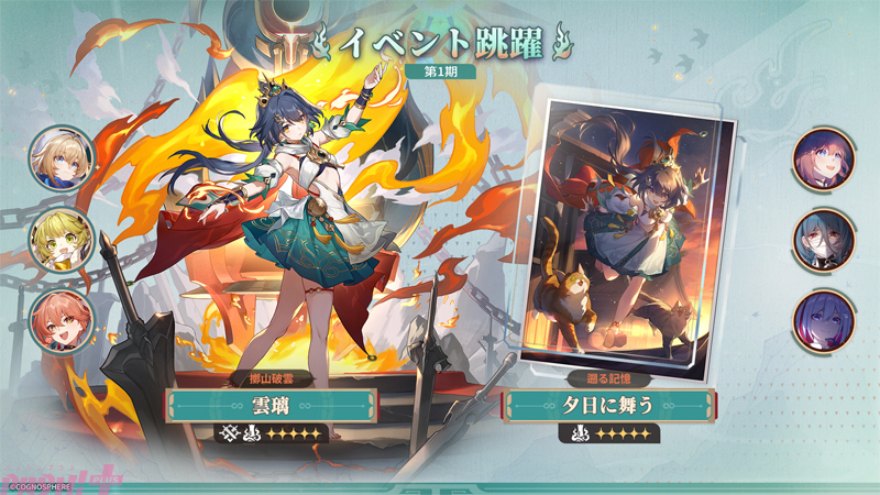 限定星5キャラクター「雲璃」(CV:若山詩音)が再登場! イベント跳躍「擲山破雲」にて「雲璃」の出現率がアップします! 同時開催のイベント跳躍・光円錐「遡る記憶」では、限定星5光円錐「夕日に舞う」が再び登場し、出現率がアップ!