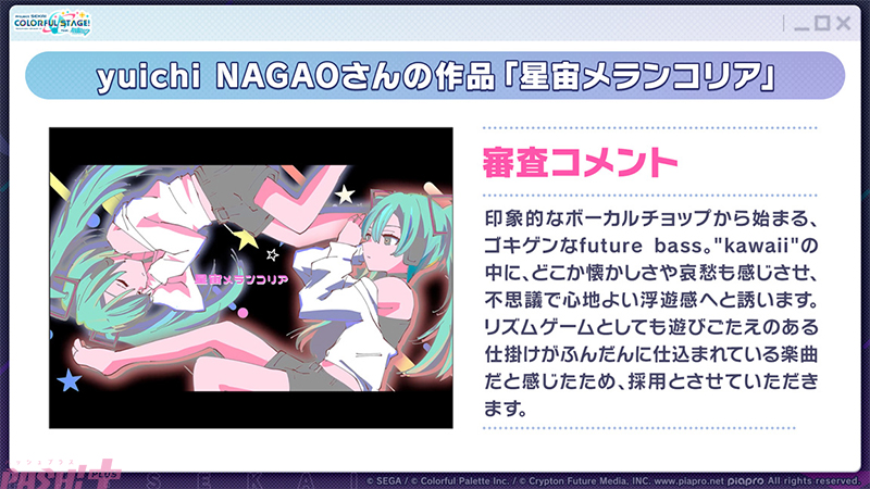 「一緒に作ろう!第26回楽曲コンテストプロセカNEXT」の採用作品が、「星宙メランコリア」(作詞・作曲:yuichi NAGAO)、「フィッシュアンドTips」(作詞・作曲:ど~ぱみん)に決定しました。採用作品は今後リズムゲーム楽曲として追加予定です。