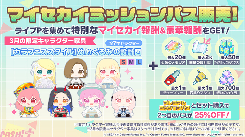 3月より、「マイセカイミッションパス」に限定キャラクター家具「[カラフェススタイル]ぬいぐるみの設計図」が登場します。