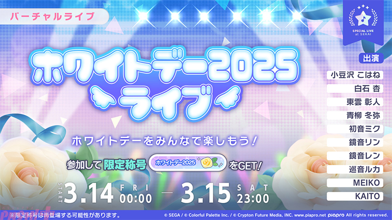 バーチャルライブにて「ホワイトデー2025ライブ」を開催します。バーチャルライブに参加すると、限定称号「ホワイトデー2025」が手に入ります。