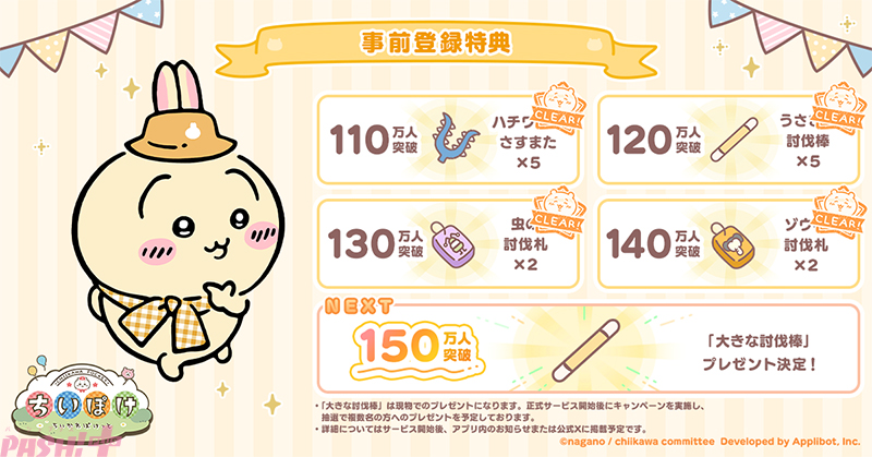 事前登録者数が140万人を突破し、特典として『ちいぽけ』サービス開始時にアプリ内アイテム「ゾウの討伐札」×2をプレゼント。150万人を達成すると、リアルグッズ「大きな討伐棒」をプレゼントするキャンペーンの実施が決定します。