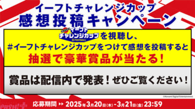 大会を視聴して、生配信の感想を#イーフトチャレンジカップ をつけてXにポストすると、配信中のチャレンジ結果に応じて、豪華賞品が抽選で当たります。賞品の内容は生配信で発表予定ですので、お見逃しなく!