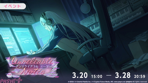 3月20日(木)より、ゲーム内イベント「Unreliable Notes」を開催中です。イベント期間中、「ひとりでライブ」「みんなでライブ」「チャレンジライブ」(リズムゲーム)をプレイすることでスコアに応じて、また「マイセカイ」では採取で消費したスタミナに応じて、「イベントP」と「イベントバッジ」を獲得できます。
