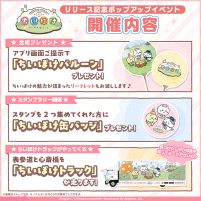 本イベントでは、「ちいぽけバルーン」のプレゼント、『ちいぽけ』のオリジナル缶バッジがもらえるスタンプラリー企画を実施する他、イベント会場周辺では『ちいぽけ』デザインのトラックが走行します。イベント参加方法や注意事項は公式サイトのお知らせをご確認ください。