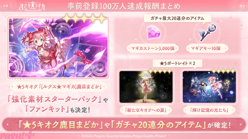 また、『魔法少女まどか☆マギカ Magia Exedra』は、事前登録者数が100万人を突破しました。これを記念し、★5キオク「[ルクス☆マギカ]鹿目まどか」や、最大20回分のガチャを引くことができるアイテムなどの報酬が配布されます。