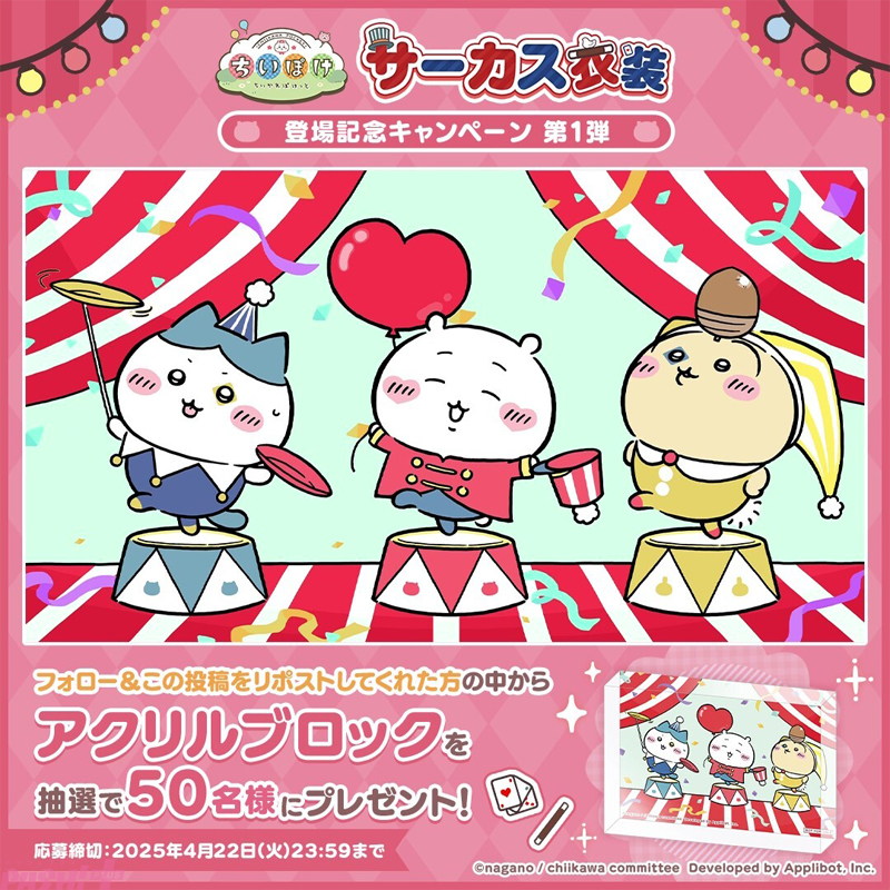 また、サーカス衣装の登場を記念したキャンペーンが公式Xにて開催。公式Xアカウントをフォローしてキャンペーン投稿をリポストした人の中から抽選で50名に、『ちいぽけ』オリジナルグッズ「ちいぽけアクリルブロック(サーカス衣装ver.)」が当たります。