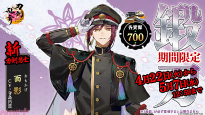 2025年4月22日(火)メンテナンス後より、新刀剣男士「面影(声優:寺島拓篤)」が期間限定で各資源「700」の鍛刀に登場します。