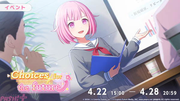 4月22日(火)より、ゲーム内イベント「Choices for the future」が開催中です。イベント期間中、「ひとりでライブ」「みんなでライブ」「チャレンジライブ」(リズムゲーム)をプレイすることでスコアに応じて、また「マイセカイ」では採取で消費したスタミナに応じて、「イベントP」と「イベントバッジ」を獲得できます。