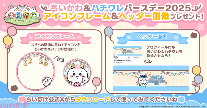 誕生日を記念し、『ちいぽけ』公式X(旧Twitter)にて、「ちいかわver.」「ハチワレver.」「ちいかわとハチワレver.」の3種のアイコンフレームとヘッダー画像も配布されます。