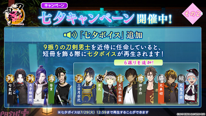 また、下記の刀剣男士を近侍に任命していると、短冊を飾る際に七夕ボイスが再生されます。